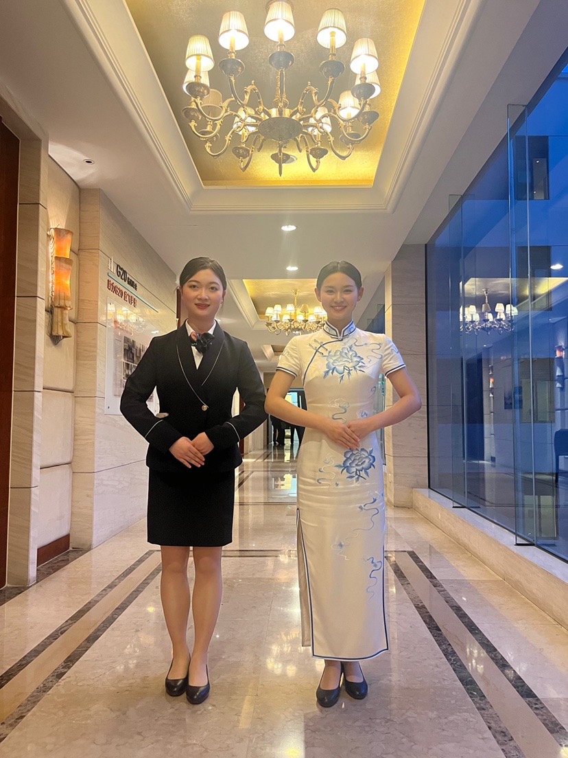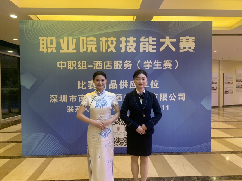 王赟同學客房禮儀展示,優雅大方,微笑甜美,禮儀展示環節得分滿分。同時,前廳接待熟練地操作流程,細心服務,得到了評委的高度肯定,前廳服務模塊得分全省第二。周佳麗同學身著乳白色旗袍,金絲針線繡著淡藍祥云,濃濃的江南風情,行云流水的動作,惟妙惟肖的餐廳杯花,栩栩如生,拉椅讓座動作嫻熟,分菜服務造型別致,體現餐飲氣質。