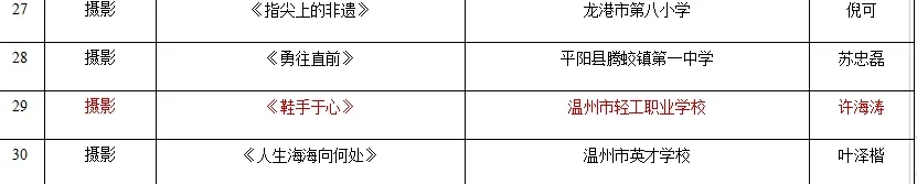近日,浙江省、市藝術(shù)節(jié)的獲獎(jiǎng)結(jié)果相繼公布,溫州市輕工職校的許海濤同學(xué)在胡李秀老師的指導(dǎo)下憑借卓越的才華,優(yōu)秀的眼光在藝術(shù)節(jié)的競(jìng)技盛宴中獲得了一道閃耀的榮譽(yù)獎(jiǎng)?wù)拢跀z影比賽類目中榮獲二等獎(jiǎng)。