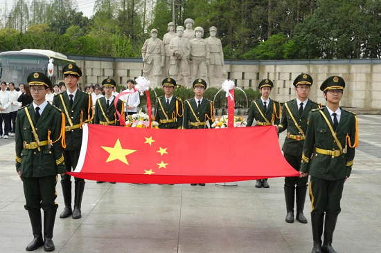 活動在雄壯的國歌聲中拉開序幕。在莊嚴肅穆的烈士紀念碑前,全體學生肅穆而立。儀仗隊正步上前為烈士敬獻花籃。