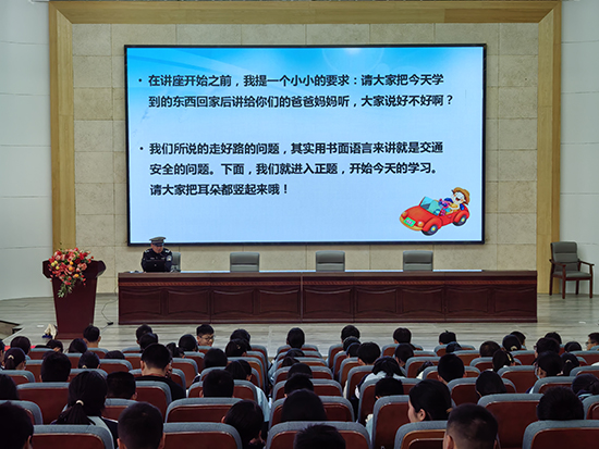 應利輝從道路交通事故嚴峻的形勢說起,指出“從小養成遵守交通法規、文明出行的良好習慣”是非常必要的,請求學生“把今天學到的東西回家后講給你們的爸爸媽媽聽,大家說好不好啊?”得到異口同聲果斷的回答“好!”