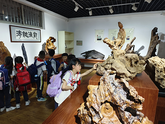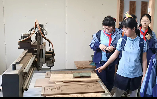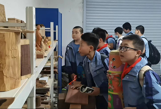 在學(xué)校的民間工藝精品館里,一件件獨(dú)具匠心的根雕、竹編、紫砂藝術(shù)作品贏得了小朋友們的“哇”聲一片。這些作品有的出自名家之手,有的是我校師生的作品,無聲地彰顯著特色專業(yè)的風(fēng)采。大家還一起走進(jìn)木雕實(shí)訓(xùn)室,見證一塊不起眼的木頭被精雕細(xì)琢成靈秀作品的過程。極具嵊州地域特色的非遺技藝之美,以木相傳,潛移默化間浸潤(rùn)少年的心,種下藝術(shù)審美的種子。