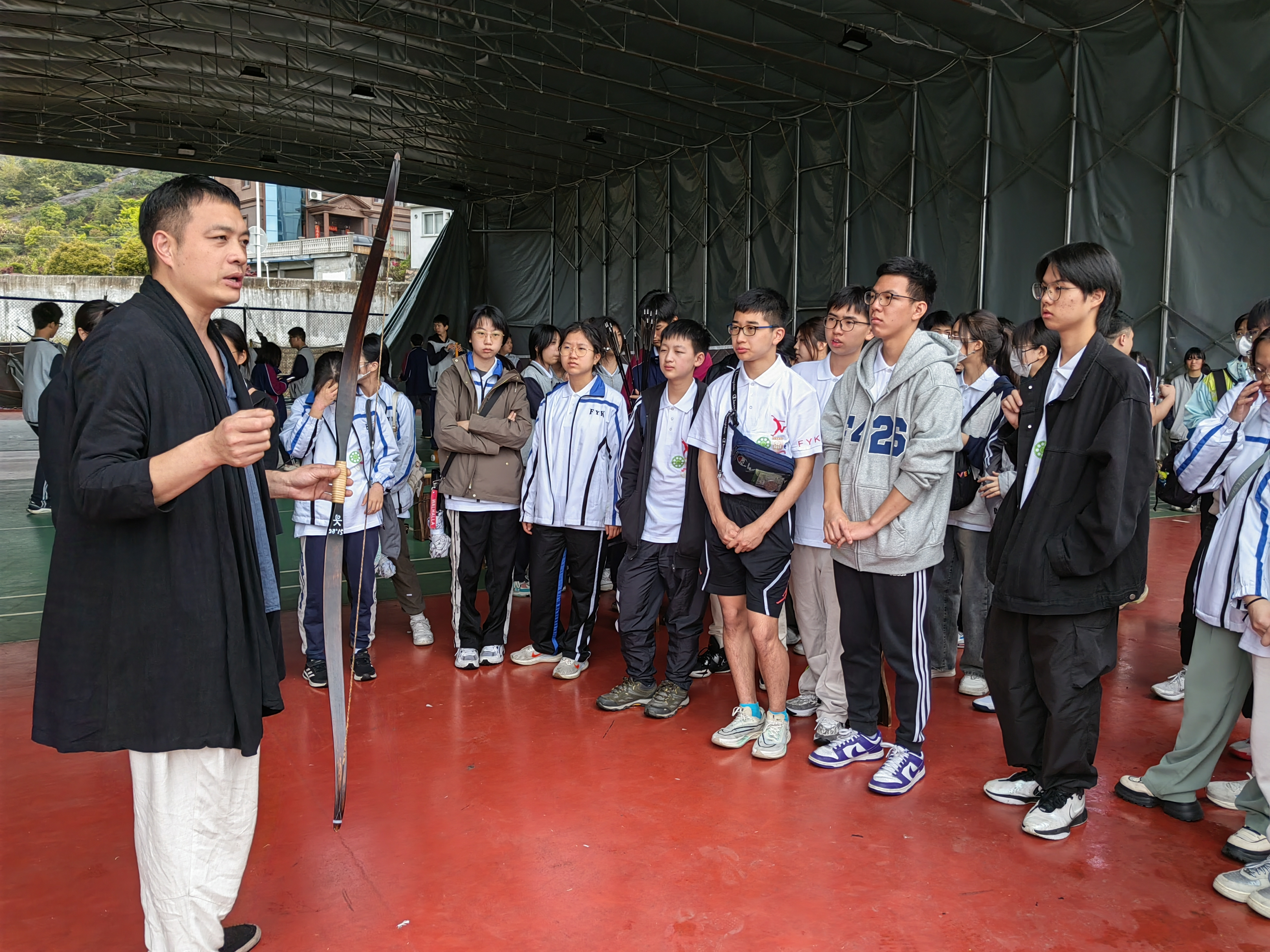 射箭冠軍吳士元給兩地學生講解射箭文化