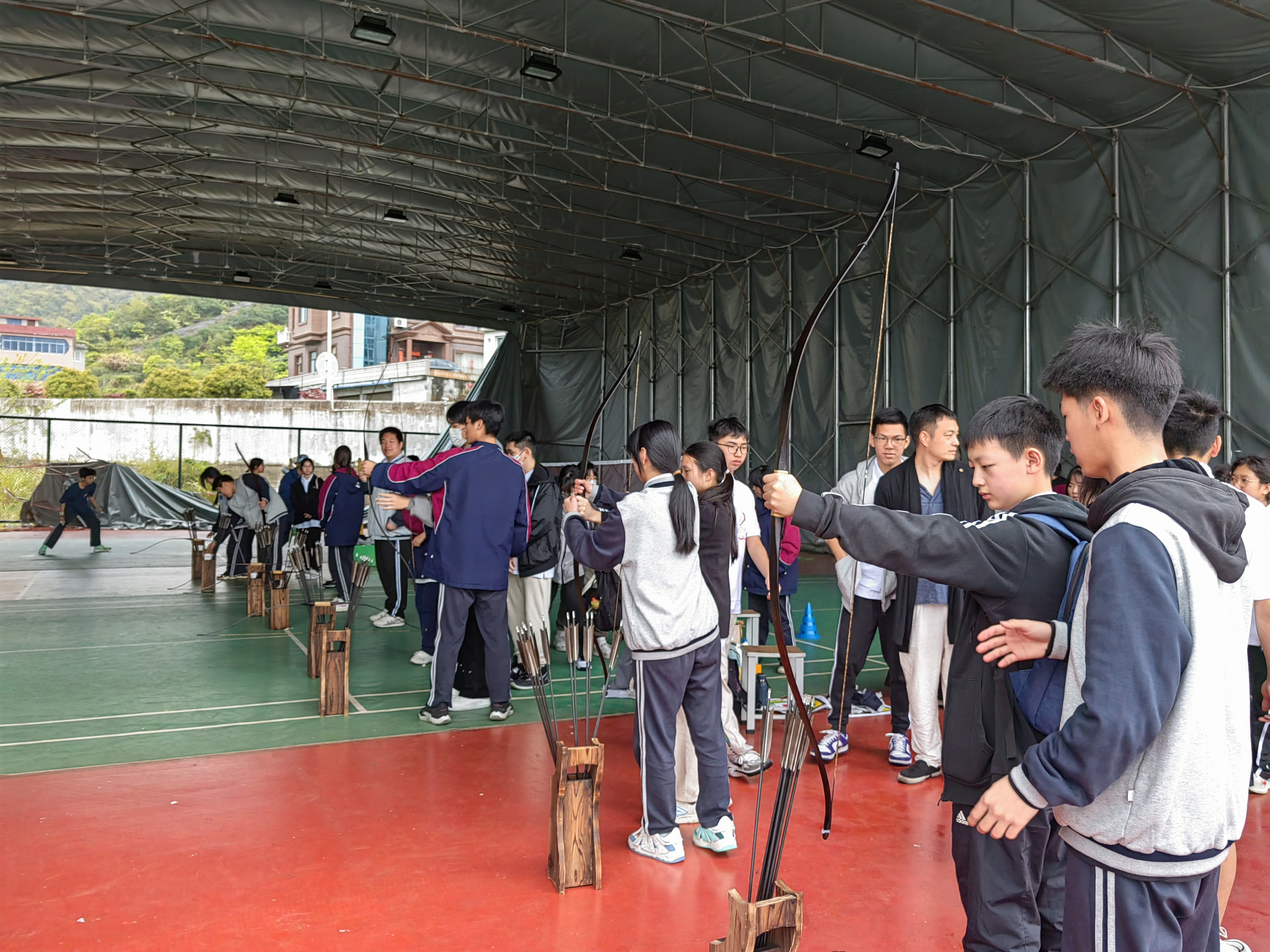 在綜合樓報告廳交流互動之后,香港中國婦女會馮堯敬紀念中學的師生們體驗了中華傳統體育項目——射箭,射箭冠軍吳士全老師介紹了射箭文化的發展史,指出禮樂射御書數為古之六藝,并展示了射禮這一中華禮儀文化。