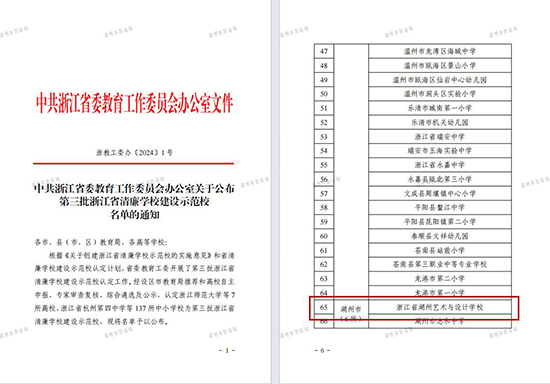 4月7日,中共浙江省委教育工作委員會公布第三批浙江省清廉學(xué)校建設(shè)示范校名單。浙江省湖州藝術(shù)與設(shè)計學(xué)校成功入選。
