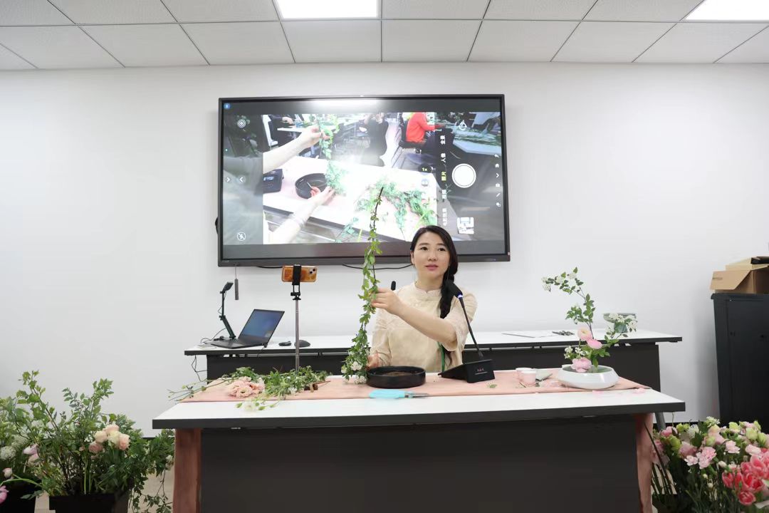 而后老師開始進行現場創作,她從選花、剪裁、顏色、層次搭配等方面進行演示,學員們緊跟老師的節奏,每一位學員發揮自己的想象力和創造力,巧手翻飛,把各種花材巧妙的搭配在一起,精心創作屬于自己的花藝作品。