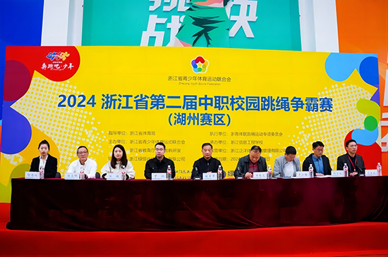 裁判員和運動員代表宣誓后,浙江省青少年體育運動聯合會會長鮑學軍宣布2024浙江省第二屆中職校園跳繩爭霸賽(湖州賽區)正式開始。