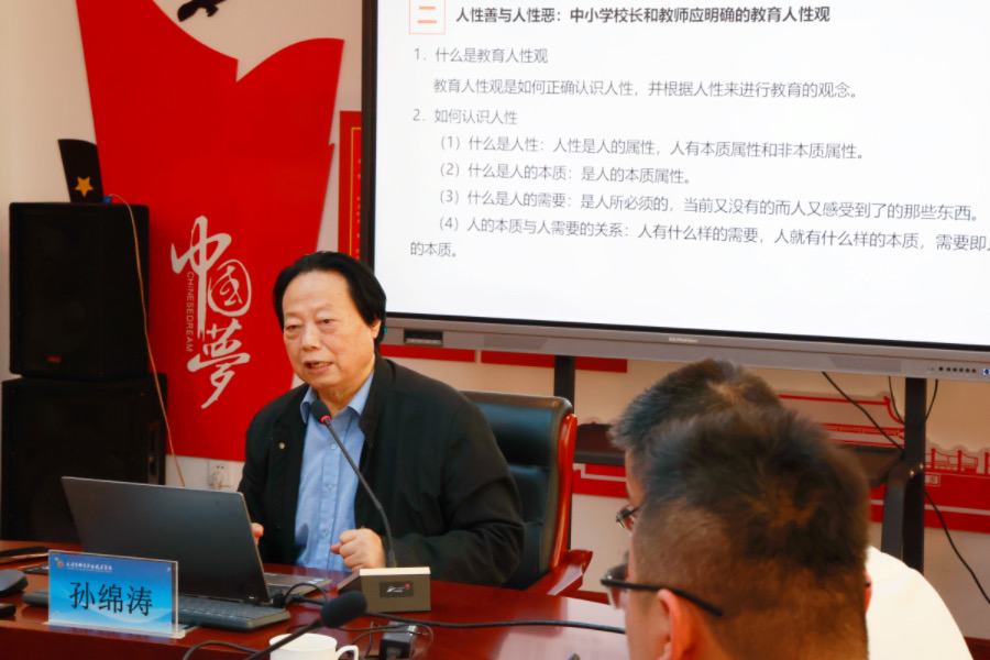 二級教授博士生導師、浙江外國語學院特聘教授、教育治理研究中心主任孫綿濤作了題為《中小學校長和教師應明確的現代教育教學觀》的講座。孫教授強調研究該問題的重要性與必要性,并具體闡釋廣義與狹義的教育觀、人性善與人性惡、全面發(fā)展與自由發(fā)展、學生中心與教師中心、知識與知識觀、自主學習與被自主學習等八點中小學校長和教師應明確的現代教育教學觀。
