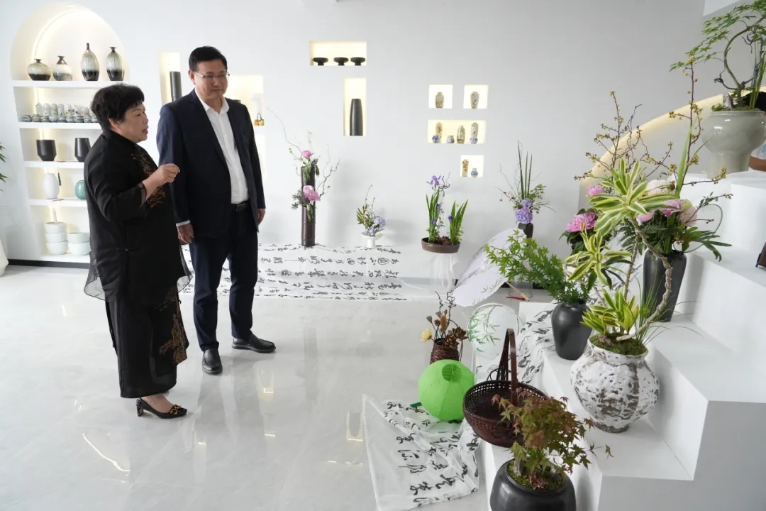 開館儀式結束后,與會領導和嘉賓參觀了花藝館和婺窯館的內部建設、作品展示、插花表演、拉皮表演、手工捏塑表演等,近距離了解國家非遺文化婺州窯的內涵以及傳統插花藝術的魅力。
