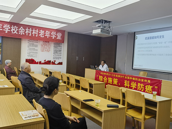 2024年4月15—21日是第30個全國腫瘤防治宣傳周。今年宣傳周主題是“綜合施策 科學防癌”。為進一步提高村民癌癥防控意識,營造村民防癌抗癌的良好氛圍,安吉縣社區教育學院天荒坪分院(天荒坪成校)特邀請安吉縣中醫院主任醫生湯荔于2024年4月21日下午在天荒坪鎮余村村文化禮堂開展“結直腸癌篩查”健康知識講座,20余名中老年人參加。