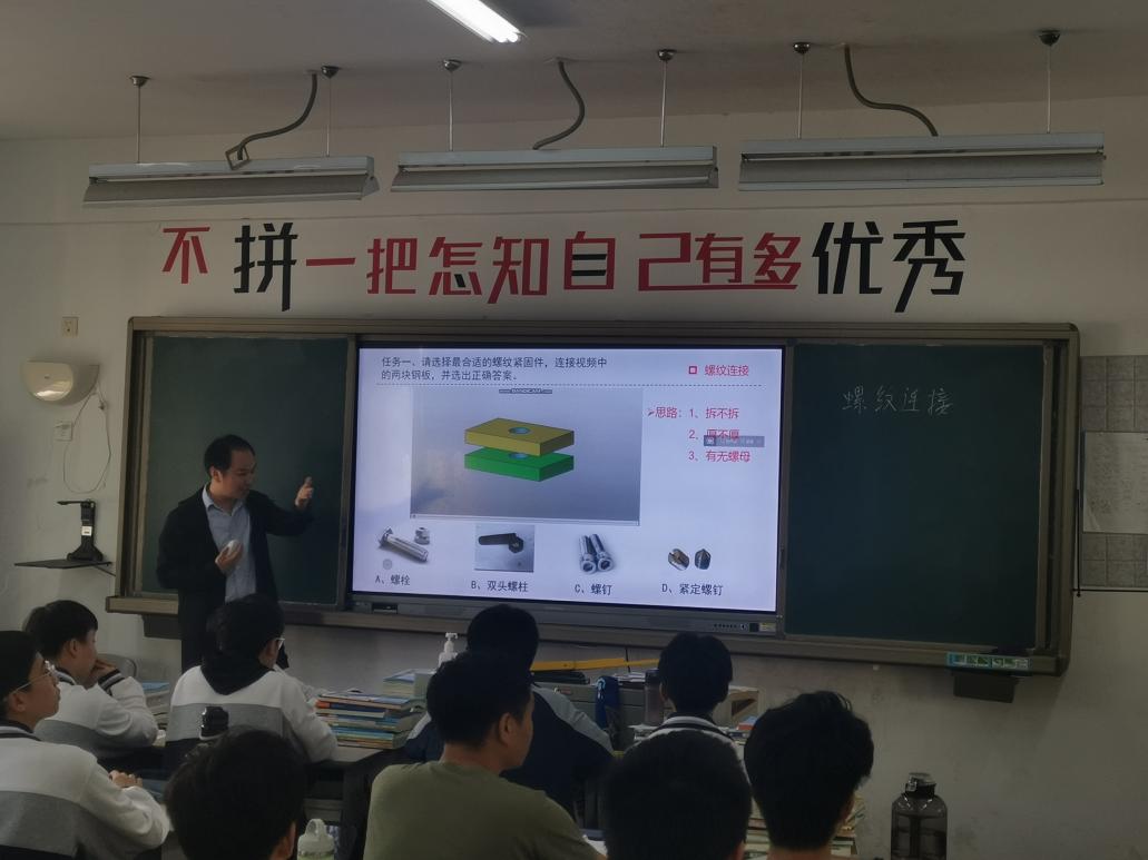 樂清市虹橋職業技術學校吳秀峰老師帶來了《螺紋連接》復習課,吳老師通過三段式教學,課前下發任務,讓學生登入問卷星完成習題,分析學生的的掌握情況。課中,通過學考趨勢分析,把握學情,確定重點。通過觀看三維模型,帶領學生思考:拆不拆、厚不厚、有無螺母,幫助學生掌握本節的重點——螺紋連接的基本類型和應用。最后,利用思維導圖引導學生歸納總結知識點。