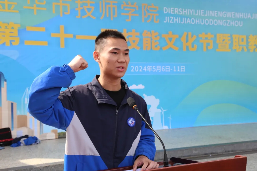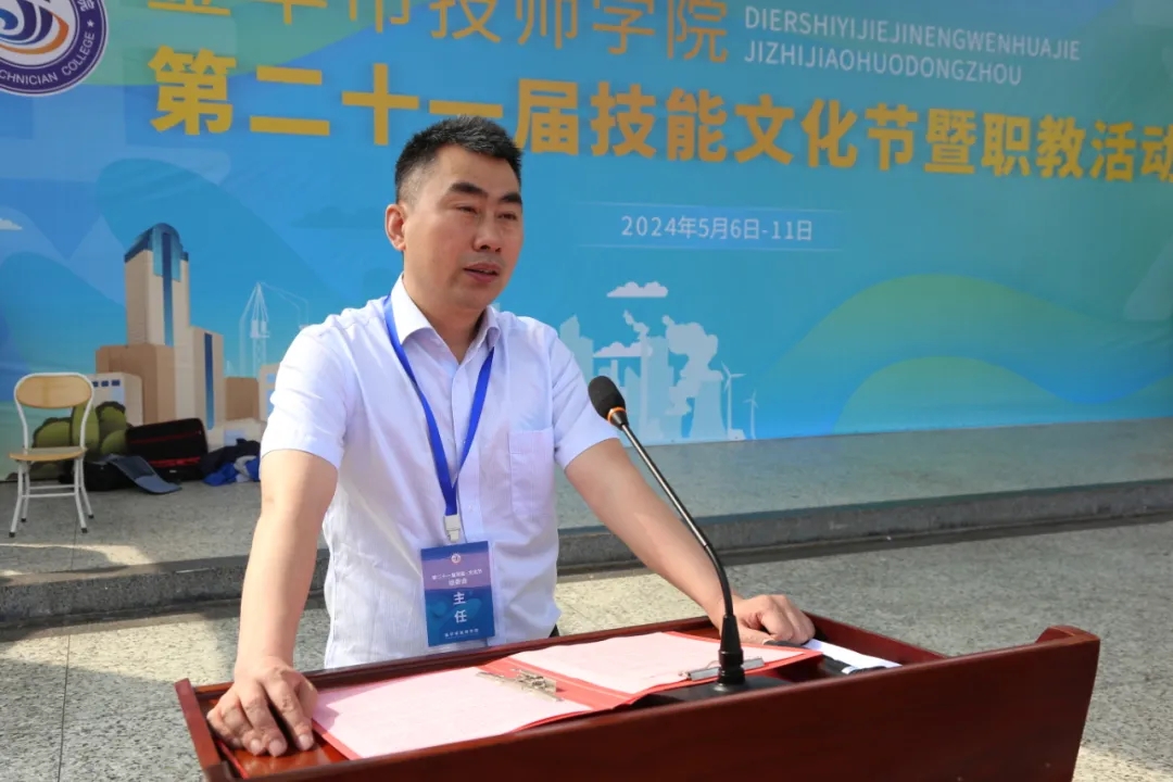 金華市技師學院黨委書記、校長、活動組委會主任劉云斌致開幕詞。劉云斌校長表示,全國兩會期間,習近平總書記強調,要實實在在地把職業教育搞好,要樹立工匠精神,把第一線的大國工匠一批一批培養出來。浙江省新春第一會上要求:加強“三支隊伍建設”,全力打造“高素養勞動者隊伍”是浙江建設之路的基礎支撐。“立德樹人”是國家大力發展技工教育的根本任務,“德技并修”更是培育大國工匠、能工巧匠的內在要求。我校作為市本級唯一一所技師學院,堅定貫徹國家政府政策方針,聚焦人才培養,爭創一流。他簡要總結了學校這一年顯著的成果,并期待全體師生都能積極參賽,百舸爭流奮勇爭先;共享盛會,沉浸競技比賽與文化藝術的熱烈氛圍。砥礪前行,以技能文化節為契機,把握新機遇,匯聚新能量,奮戰新征程,走出屬于金技的特色之路。