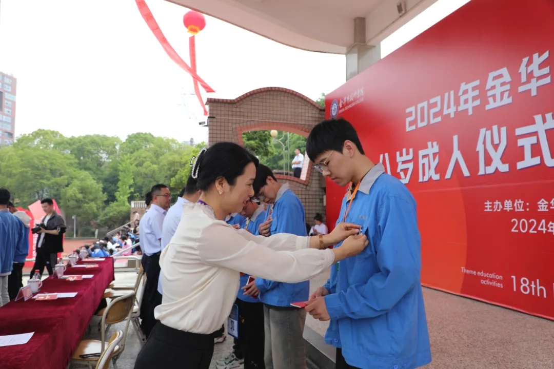 校領導為學生代表佩戴成人紀念章。