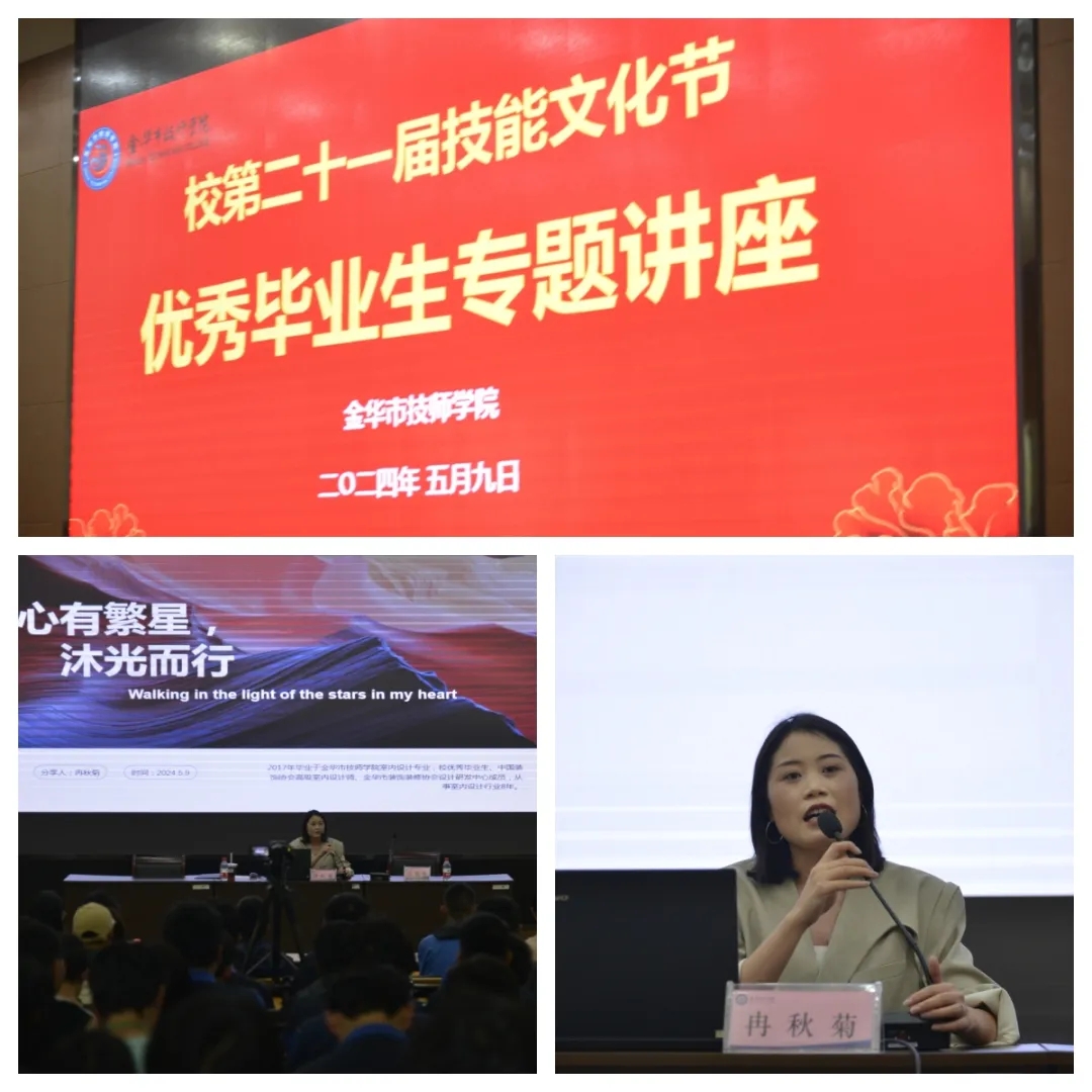 中國裝飾協會高級室內設計師、金華市裝飾裝修協會設計研發中心成員,學校2017屆室內設計專業畢業生冉秋菊與浙江碩和機器人科技股份有限公司銷售總監、前端開發工程師、車間政委,學校2009屆計算機輔助設計與制造專業畢業生盛曉祥。兩位優秀畢業生回校為學弟學妹們開設講座。他們分享了自己的在校就讀經歷、職業成長生涯、技能奮進路上的感悟,真摯的話語,精彩的講座,令學子們沉浸其中,收益良多。