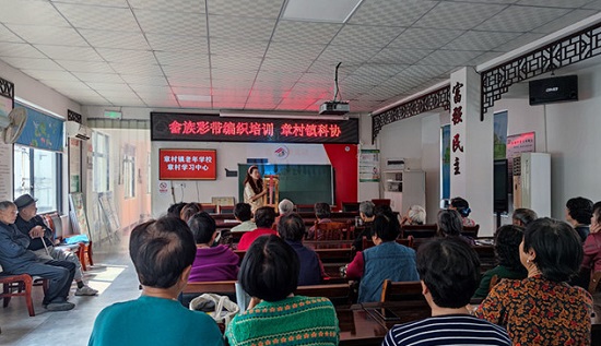 為傳承發揚畬族非遺彩帶編織技藝,豐富老年人日常生活,5月9日,安吉縣社區教育學院章村學習中心在章村村老年協會開展畬族彩帶編織培訓,共計52位村民參加培訓。