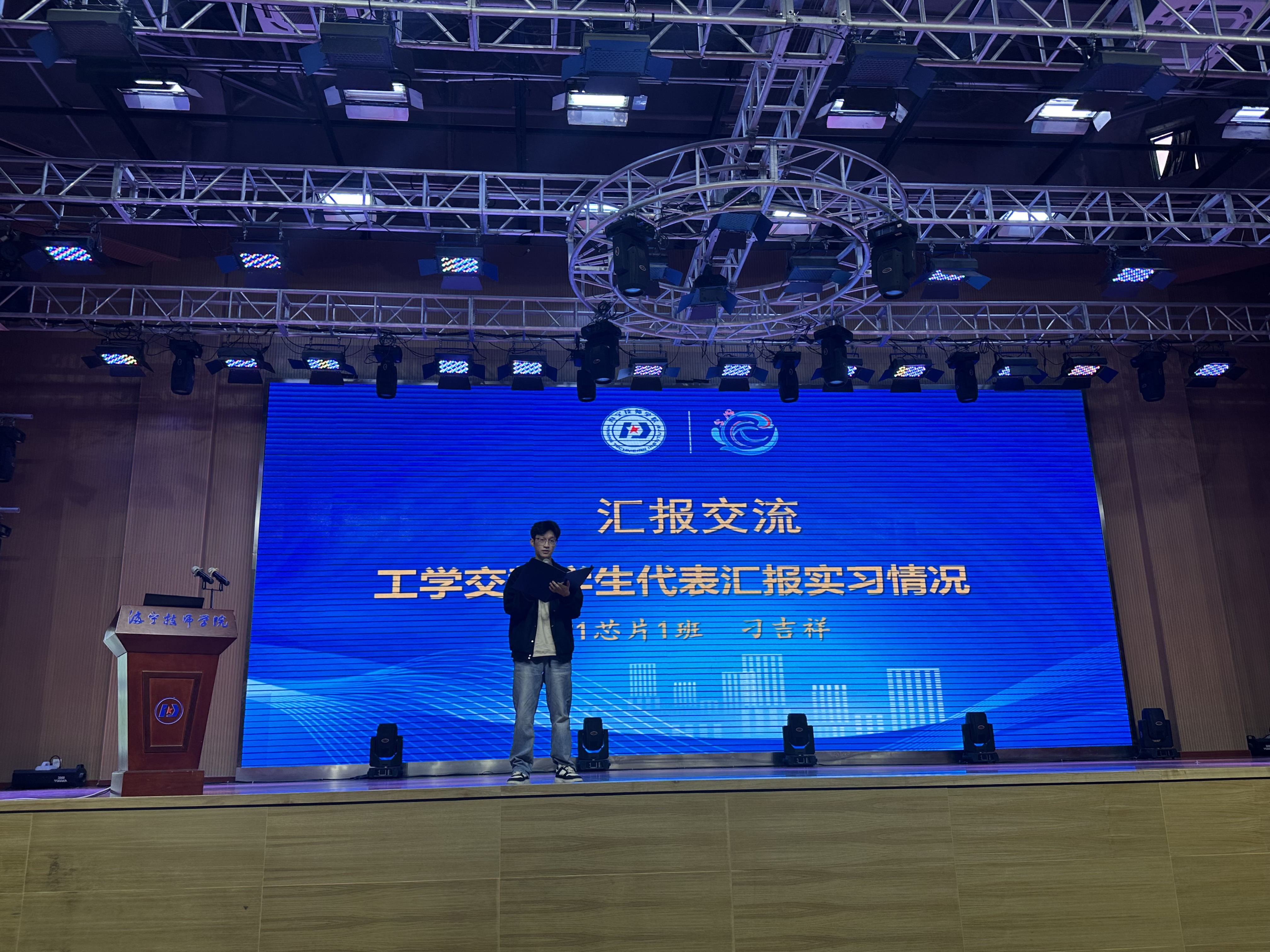 在匯報交流環(huán)節(jié)中,工學交替班級學生代表21芯片1班刁吉祥同學上臺發(fā)言,他詳細介紹了自己在實習期間的所見所聞和所學所感。刁同學表示,實習經(jīng)歷不僅讓他學到了專業(yè)知識和技能,更重要的是讓他明白了責任與擔當?shù)闹匾浴?/p>