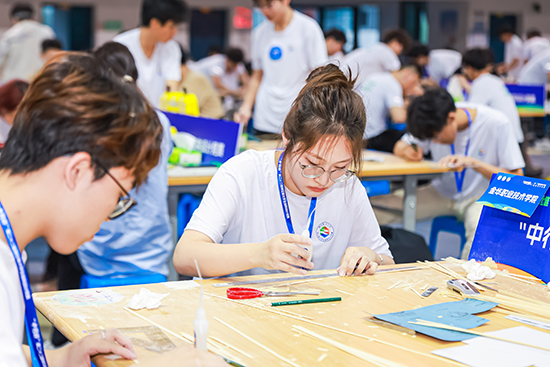 本屆大賽以“懸挑觀景平臺(tái)結(jié)構(gòu)設(shè)計(jì)與模型制作”為選題,包含理論方案、模型制作、陳述與答辯、加載試驗(yàn)等環(huán)節(jié)。參賽選手們制作的模型由不超過105根竹材制作而成,竹材厚度1毫米、寬度2—6毫米和長度不超過900毫米,整體約重100—300克,能承受模型自重的50倍荷載。大賽用三個(gè)鋼球來模擬人群荷載,在4分鐘的加載時(shí)間內(nèi),當(dāng)模型出現(xiàn)結(jié)構(gòu)整體垮塌,或模型發(fā)生位移、測試報(bào)警器響起,或加載過程中任意小鋼球滾出觀景平臺(tái)道板,均視為模型加載失敗,加載過程驚險(xiǎn)又刺激。