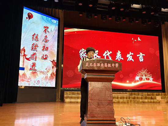 隨后,23數控1班胡為一家長也上臺發表了感言。她對學校的工作表示肯定與感謝,同時也分享了自己在家庭教育方面的經驗和心得,提出家長應調整自己看待孩子的眼光,多理解和接納,多認可和鼓勵孩子,多與學校溝通,共同關注孩子的健康成長。