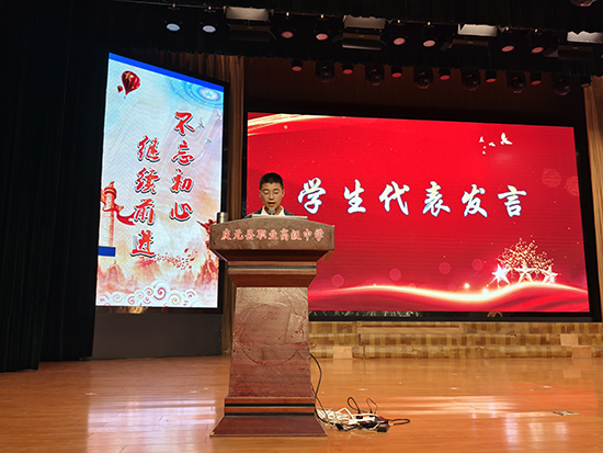 接著,23計算機1班范孜羽同學作為學生代表上臺發言。他不僅表達了對未來的期許和信心,也向家長和老師表達了感激之情,同時還承諾將繼續努力學習、積極成長。