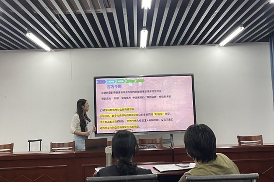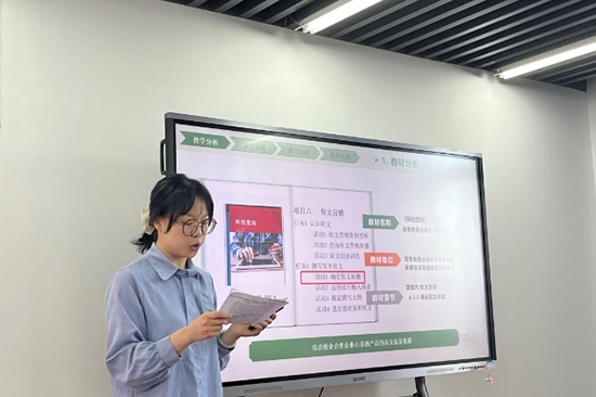 張優娣老師“會當凌絕頂,一覽泰山景”的說課內容選自高等教育出版社的《旅游文化》。張老師以微課預熱,利用ClassIn搭建師生互動平臺。通過希沃白板小游戲與VR全景等多種方式,加深學生對泰山景觀特征的了解,鍛煉學生導游詞撰寫、設計游覽路線的專業能力。課程活動形式新穎、課堂氛圍活躍。