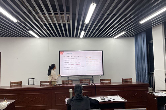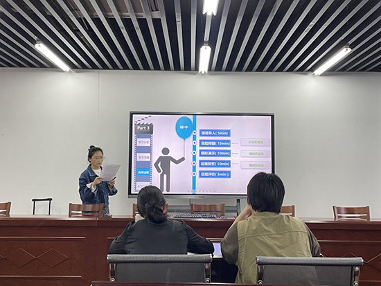 學校9位青年教師分成專業課組與文化課組依次上臺進行說課展示。老師們圍繞教學內容,從設計意圖、教學目標、教學重點難點、教學方法、教學流程、板書設計以及教學特色等方面進行了全面的闡述。