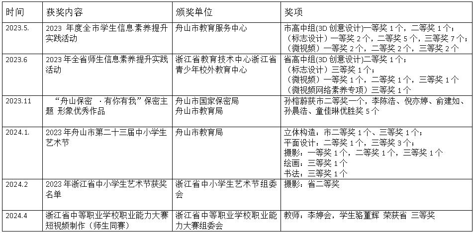 近年來,學校以匠品美、匠技美、匠心美、匠藝美、匠勞美“五美育匠”品牌建設為抓手,以美育人、以美化人、以美培元,把美育納入人才培養全過程。積極組織學生參加“舟山保密—有你有我”“潮聲海市”logo等設計比賽和省市信息素養、中小學藝術節比賽,把比賽項目作為課堂教學內容,全面全方位提高設計技能和提高審美能力,取得了一系列豐碩成果。