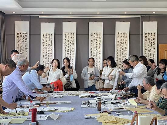 “屬雞的詩在哪里?”“有屬猴的詩嗎?”考察團(tuán)成員在書法創(chuàng)作室被“左筆書法大師”顧關(guān)心老師的書法作品吸引,紛紛用手機(jī)拍照留存。