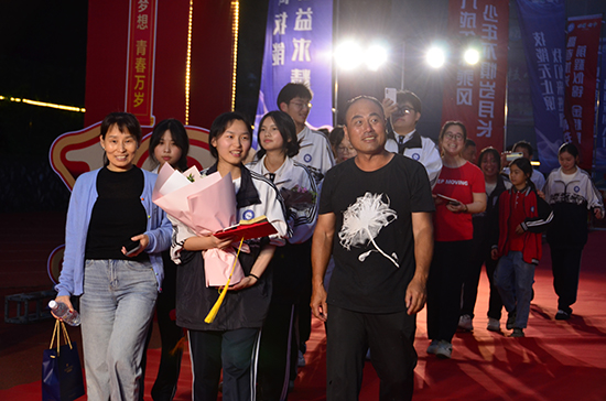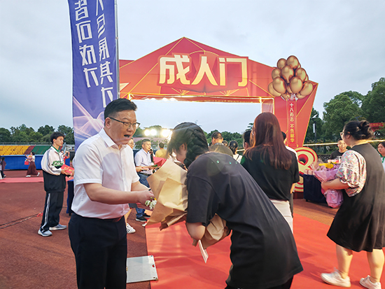晚會開始前,紅毯鋪就的通道兩旁,擂鼓聲聲,同學們面帶微笑,在家長們的陪同下,自信地走過紅毯,接過校領導們贈送的《憲法》,跨過成人門,邁向人生的新階段。
