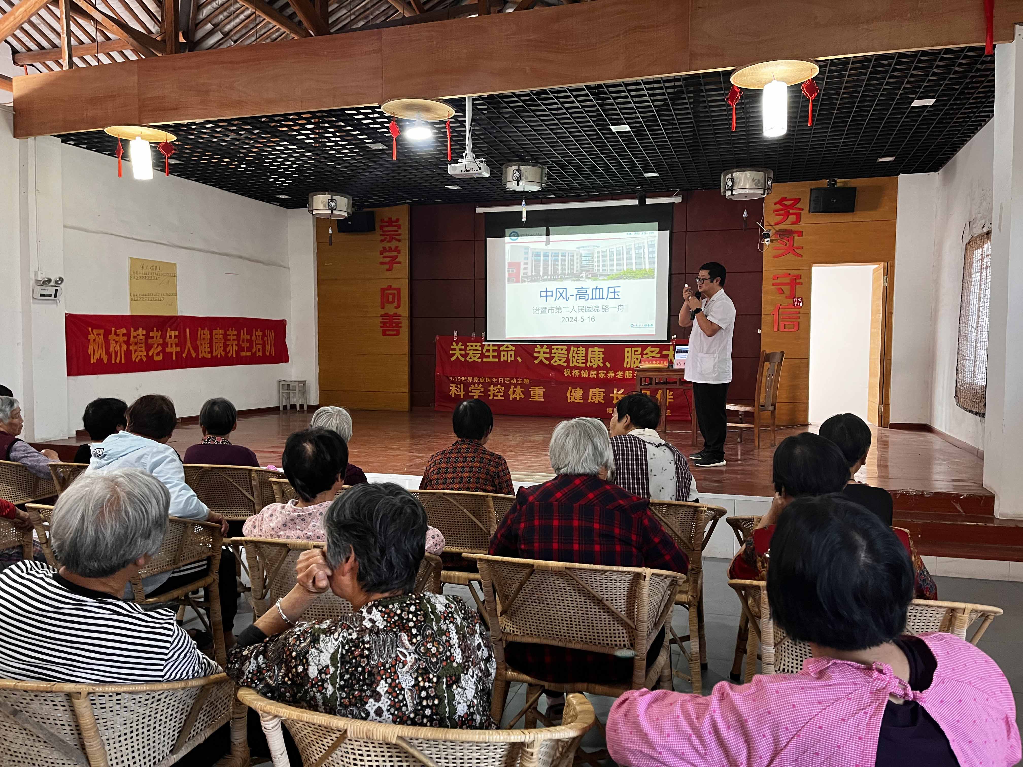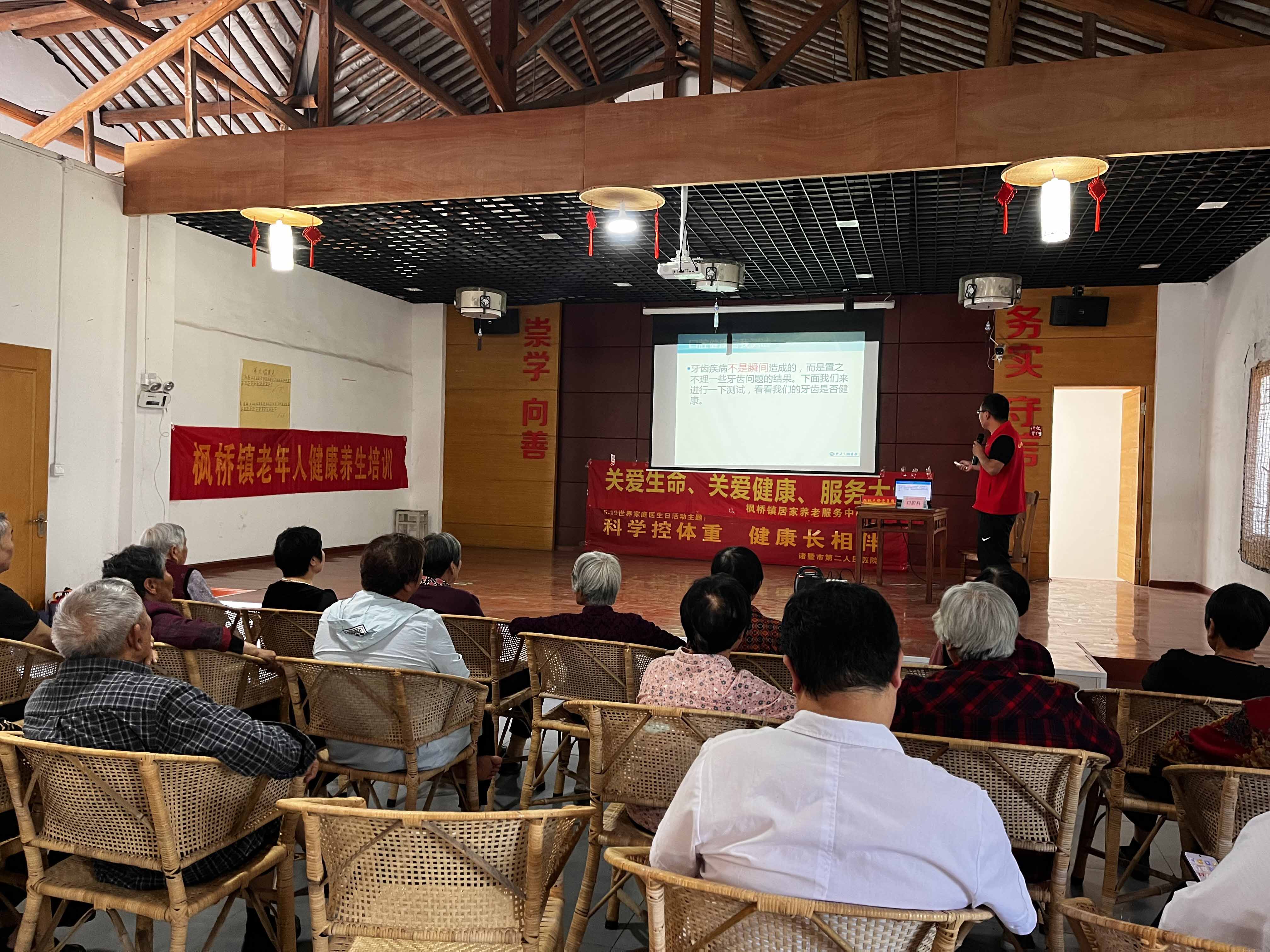 5月16日下午,諸暨市楓橋鎮社區教育學校邀請諸暨市第二人民醫院內科主任駱一舟、口腔科副主任蔡國飛兩位專家來到楓橋鎮樓家社區文化禮堂,為老年人講解健康養生知識。