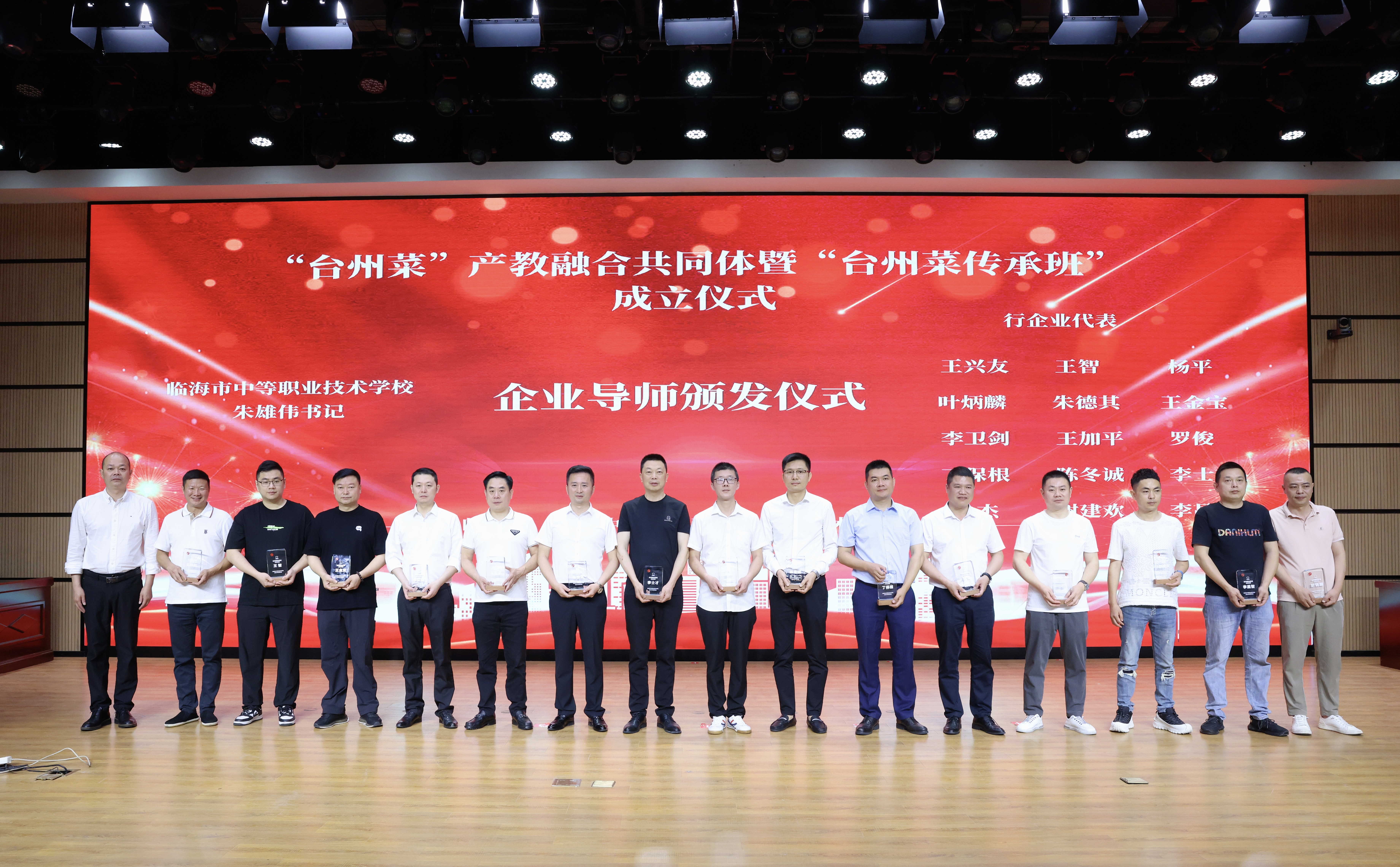 臨海市中等職業技術學校黨總支書記朱雄偉為企業代表頒發傳承班“企業導師”聘書。