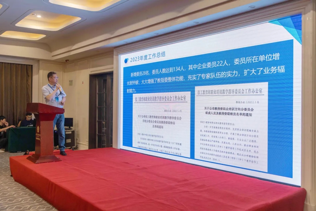 大會第二階段,新能源與交通運輸類教指委主任委員、河南交通技師學院院長李強作2023年度工作報告,并就2024年工作計劃作了部署。杭州技師學院黨委書記邵偉軍以《建設高水平交通特色院校 培養高素質綜合交通運輸技能人才》為題為大會作專題講座,重點介紹杭州技師學院專業建設、產業學院和企業學院創建、高技能人才培養體系構建等方面經驗做法和典型案例。
