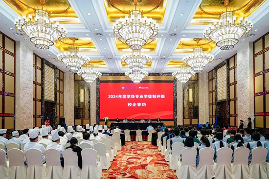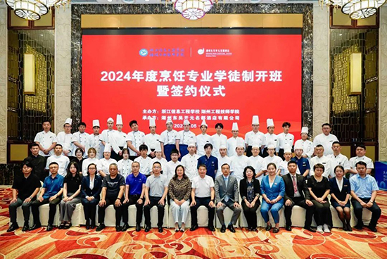 5月29日下午,浙江信息工程學校·湖州工程技師學院與湖州東吳開元名都酒店有限公司、湖州市城投觀湖酒店有限公司、浙北大酒店、天煌大酒店、湖州賓館有限公司、湖州南潯博陽開元名庭度假酒店、龍之夢雅仕酒店的代表齊聚東吳開元名都酒店開元廳,共同舉行2024年烹飪專業現代學徒制開班暨簽約儀式。