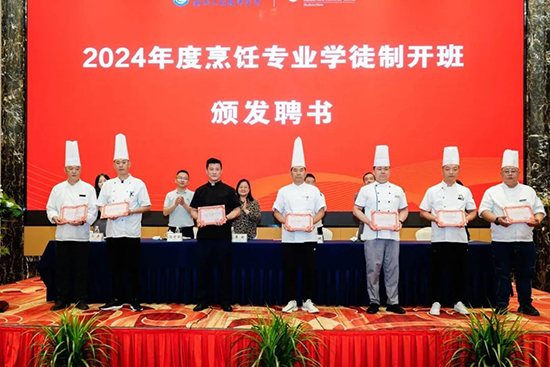 接著,湯校長代表學校和七家酒店分別簽署了校企合作協議。酒店的帶隊師傅上臺領取了學校頒發的聘書并合影留念。