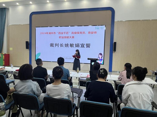 本次大賽共24位育嬰員和34位保育員參加,均由全區各幼兒園擇優推薦。大賽啟動儀式由吳興區教育局學前教育指導中心胡麗敏主任致歡迎詞,參賽選手代表宣誓,藝校姚敏娟作為裁判長代表裁判員宣誓。