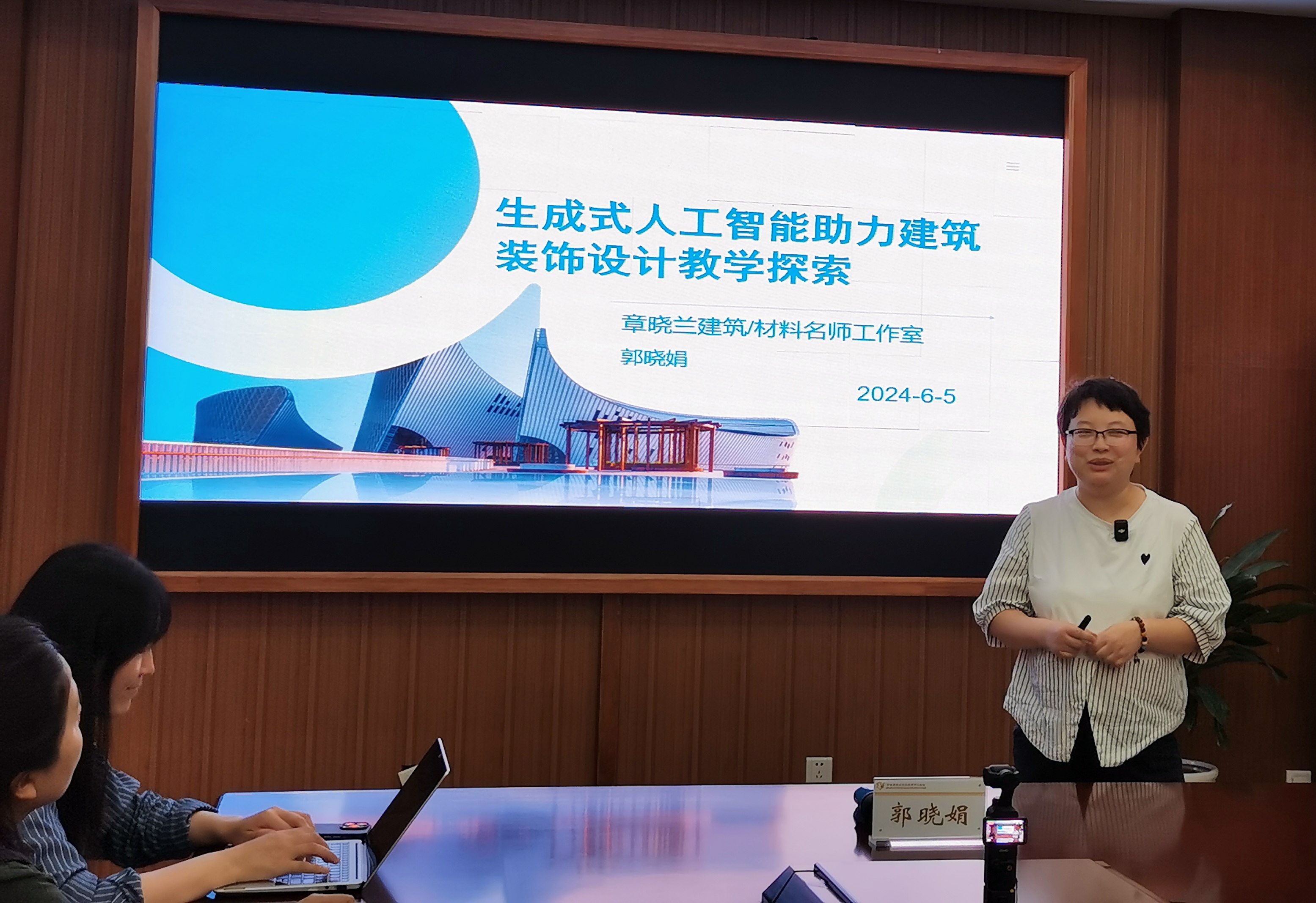 郭曉娟老師代表章曉蘭名師工作室,分享了《生成式人工智能助力建筑裝飾設計教學探索》的主題論壇。她聚焦于如何將生成式人工智能技術應用于建筑裝飾設計教學中,以AI人工智能相結合的方式提高學生的設計能力和創新思維。