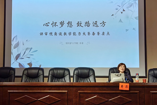 隨后,紹興護士學校副校長、高級講師、全國職業技能大賽優秀指導老師、浙江省中職學校“最美教師”壽菲開展了《評審視角談教學能力大賽備賽要點》講座。壽老師圍繞文件要求、團隊組建、實施報告以及現場比賽等多方面作了講解,并對團隊的重要性和分工進行重點講解。她提到,教學能力大賽的成功離不開一個好的團隊,明確的分工與合作能夠讓每一個環節事半功倍。