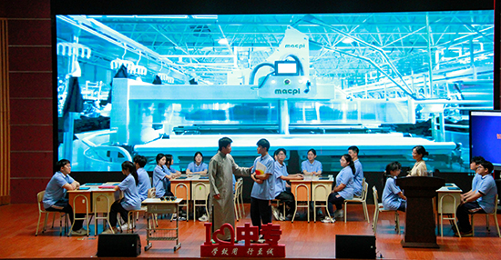 活動的第一個環節是兩堂班會課公開展示。第一堂課由紹興市中等專業學校郁魏魏老師展示的《最愛,那一抹中國紅》,整堂班會課由四個篇章組成,從一開始的互動環節什么是中國紅入手開啟第一篇章,四個小組同學分別展示和介紹漆器、春聯、新娘嫁衣、茜草,讓學生形成如果文化有顏色,那一定是中國紅的活動體驗和感受;第二篇章以國旗為教學媒介,通過男女聲情并茂的詩歌朗誦,達成第二個活動預設:如果信念有顏色,那一定是中國紅;第三環節以微距猜物的小游戲,讓學生知道宇航服、南極防寒服、滑雪服上的那抹紅是紡織專業人的智慧凝聚,如果奇跡有顏色,那一定是中國紅為第四篇章蓄勢;第四篇章古今穿越,實現如果青春有顏色,那一定是中國紅的愛國主義教育。
