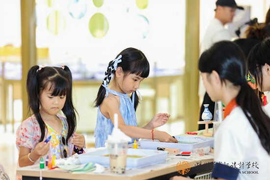 6月23日下午,湖州銀泰城一樓中庭里,做完拓染扇子的小朋友一臉興奮地舉著自己的作品,等待扇面上的顏料晾干。這是浙江省湖州藝術與設計學校第十五屆校企合作成果展中的項目體驗活動之一。