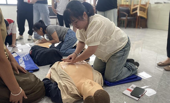 在模擬實操階段,學員們在老師的指導下,對人體模型進行單人心肺復蘇急救練習。針對實操中出現的不規范動作,老師進行逐一糾正,并詳細解答同學們提出的問題。