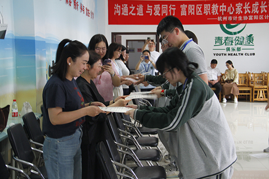 5月11日下午2時,隨著孩子給父母頒發(fā)結業(yè)證書、集體合影留念,共有24名家長帶著滿滿收獲和聲聲祝福結束了杭州市富陽區(qū)職業(yè)教育中心第七期青春健康“溝通之道”家長成長營的全部課程。本次“溝通之道”家長成長營的培訓活動從4月19日正式拉開帷幕,每個周五下午兩個小時,歷時四周,將六個主題的活動融入其中。