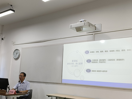 浙江省特級教師陳建新給學員們作專題講座《核心素養(yǎng)落地的策略與建議》。陳老師從新課標的角度出發(fā),用五個案例強調(diào)了課程體系與教學內(nèi)容是核心素養(yǎng)落地的重要載體,學校和教師應依據(jù)核心素養(yǎng)的要求,對現(xiàn)有課程體系進行優(yōu)化調(diào)整,確保學科教學能夠緊密圍繞核心素養(yǎng)展開。