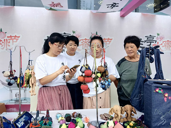 活動當天有很多關于水蜜桃主題的展位,蘭亭成校蘭彩拼布共富工坊展位也在其中,展臺上擺放著用拼布手藝縫制的水蜜桃,和原創水蜜桃環保袋,以及一些拼布的小手工作品,吸引了很多游客的駐足觀賞,水蜜桃的拼布工藝品甚至可以以假亂真,小朋友們都愛不釋手。
