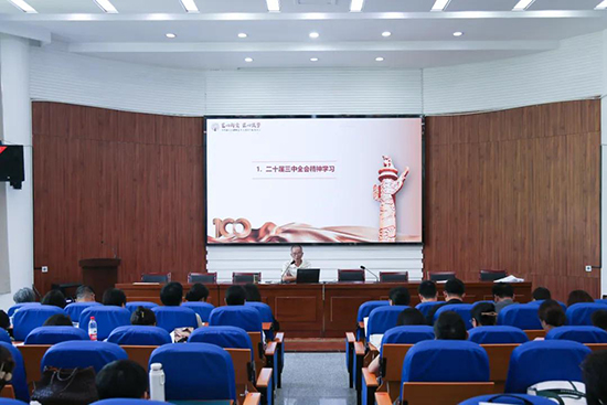 最后,校黨委書記唐海佺作題為《大力弘揚教育家精神 為學校高質量發展賦能——二十屆三中全會精神學習》的講話,帶領全體教師深入學習了《中共中央關于進一步全面深化改革、推進中國式現代化的決定》,并對教育領域的相關內容作了重點解讀。他以教育家精神為引,強調教師應樹立正確的世界觀和人生觀,建立正確的價值觀,擁有求真的育人能力,具有務實的育人行為和持有弘道的育人追求。