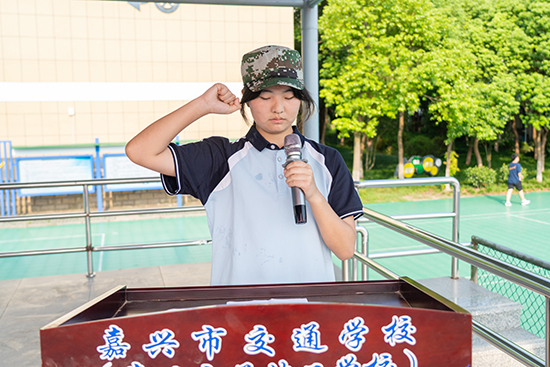 24高鐵乘務班何富珍代表新生發言。她講到,軍訓是中職生活的第一課,同學們將在這里播種新的希望,啟航新的征程。面對炎炎烈日,同學們要以戰士的情懷、軍人的姿態,去揮灑晶瑩汗水、踐行青春誓言。隨后,她帶領全體新生進行宣誓。