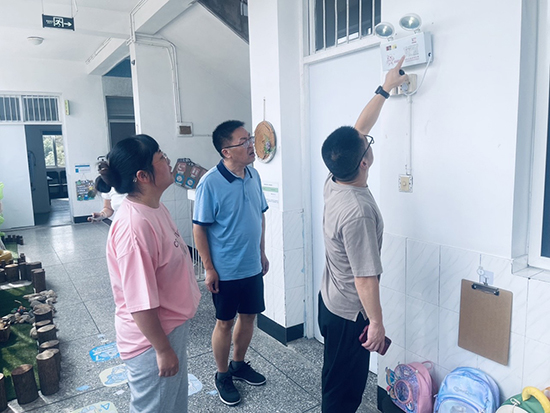 在楓橋鎮(zhèn)旺妙幼兒園。中、大混齡班的幼兒們正在操場由老師帶領(lǐng)下開心地做操。在園長駱紅環(huán)陪同下,郭燁等人查看三層園舍、環(huán)境裝飾,問詢新進幼兒情況。整個園內(nèi)設(shè)施完備、環(huán)境整潔,勞動實踐園地內(nèi)郁郁蔥蔥。只是一樓樓梯間有雜物堆放,提醒要及時搬離。
