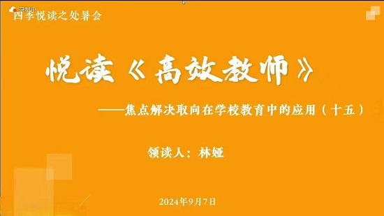 與以往不同的是,本次讀書會特別邀請了4位學生參與,共同探討一個話題——“如何讓教育盡可能自然而然地發生”,這是“四季悅讀”線上讀書會的一次創新嘗試。在過去,讀書會主要聚焦于教師之間的交流,共同研讀《高效教師:焦點解決取向在學校教育中的應用》,探討如何為學生提供最合適的教育。