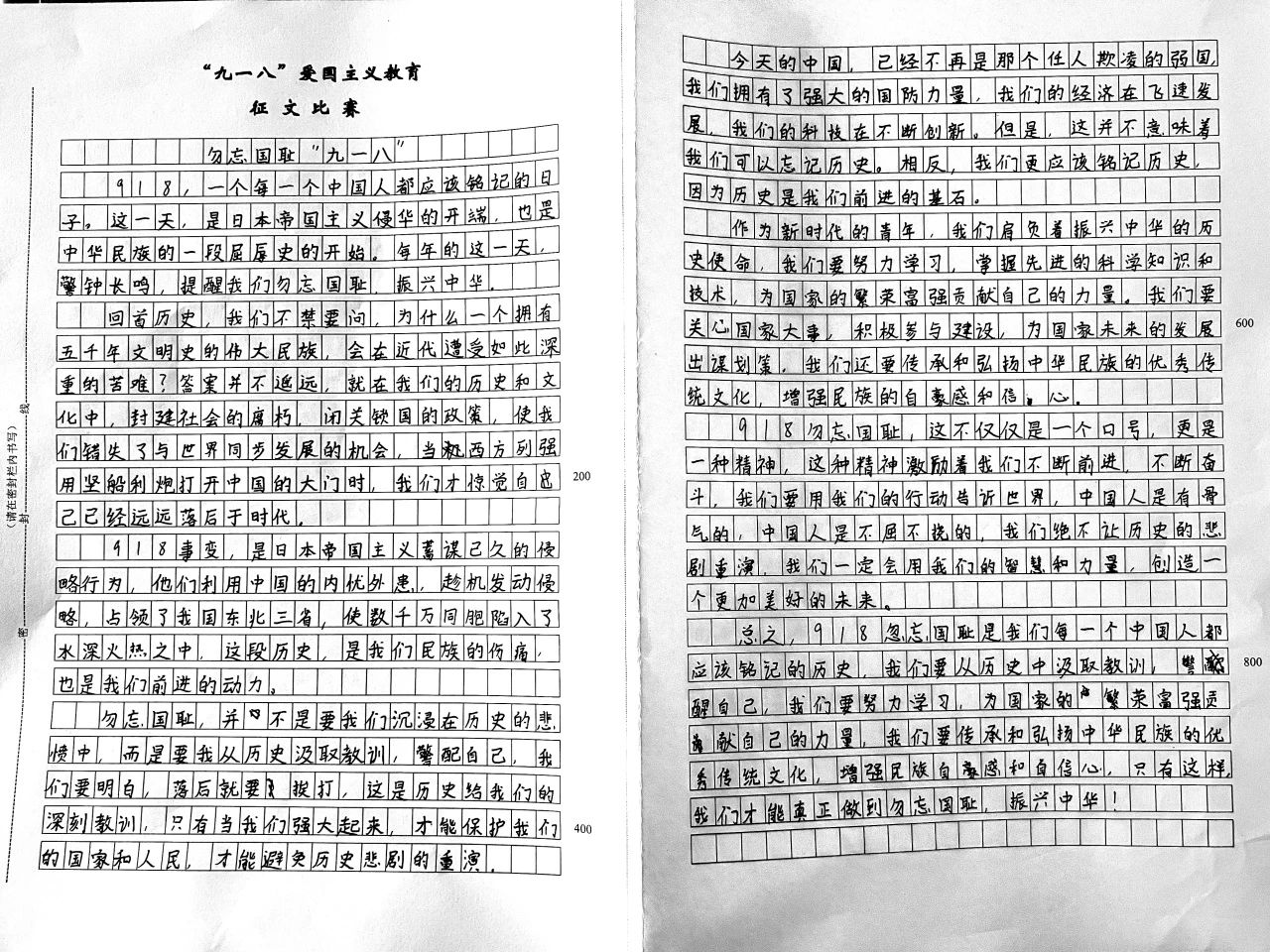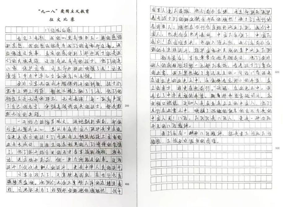 集體觀影后,團(tuán)委和學(xué)生處聯(lián)合組織“九一八”愛國主義教育征文活動。