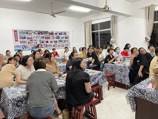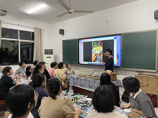 創意手工編織班里,鋪在桌面上的一塊塊青花臺布將教室里的藝術氛圍直接拉滿,學員們圍坐在桌子周圍專心地編織著茶葉罐頭。“這門課程我太喜歡了!你看,我按照老師教我們的方法,用麻繩、花邊、珠子、流蘇等材料制作了一個茶葉罐,漂不漂亮?”學員范雅紅舉著親手做的茶葉罐高興地說,“這次創意手工課程還安排了筆筒、收納筐、籃子、花籃等手工藝品的制作,我們對后面的培訓活動充滿了期待。”