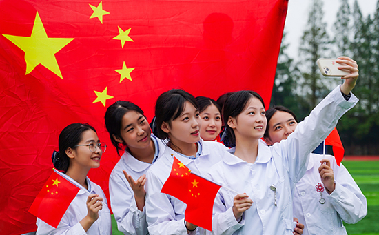 有一種驕傲和自豪,是我與國旗合影。操場上,長廊間,閱讀亭,不同專業(yè)不同年級的同學(xué)們揮舞著紅旗,擺出各種造型,用鏡頭記錄與國旗同框的美好瞬間,用簡單質(zhì)樸的方式祝福偉大祖國。