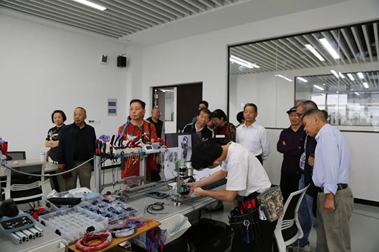 考察組參觀了校園工程建設沙盤展示區、模具智能制造產線、電控設備、數字孿生等多個工學一體化學習工作站,以及第47屆世界技能大賽可再生能源項目的中國隊集訓基地。