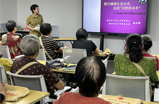 開班儀式結(jié)束后,三十多位中老年學員共同聆聽了施醫(yī)生關(guān)于《踐行健康生活方式,遠離沉默的殺手——淺談中老年高血壓病防治》專題講座。講座長達兩小時,施醫(yī)生就重視高血壓、了解高血壓、高血壓的治療和健康生活方式、如何家庭自測血壓、血壓波動時的自我管理五大方面,作了耐心細致、深入淺出的講解,深受中老年學員歡迎。